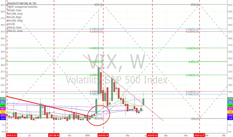 Volatility Index (VIX). Weekly chart moving in to next time cycle peak with VIX spiking.