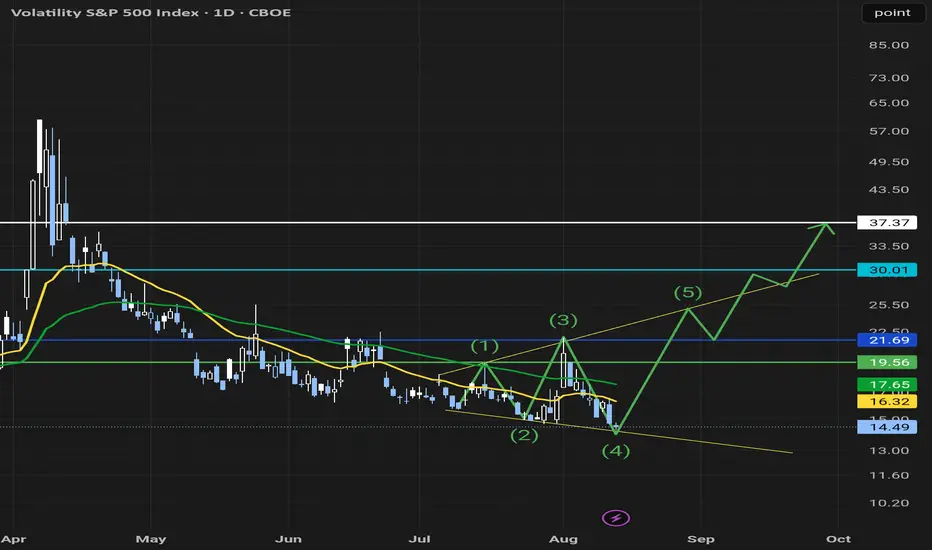 This is what I am seeing for VIX.US. 5 wave megaphone on the daily. Each vertical line corresponds to liquidity gaps that are still present. We had a very similar pattern on SPY.US I personally played, but I have not posted it on here. I'll start sharing my ideas more often as I get more used to using this. ๐ Perhaps it might look a bit exagerated however If you break down SPY.US in small sections on the 4h, its really just a few patterns that repeat in 3s for each circle. After each circle is complete it drops to a lower level from which it rebounds and begins a new circle of 3 reoccurring patterns. After the completion of each such cycles the pull back is bigger with the third one being the biggest like the one we had last April which was basically the end of the 3rd and final cycle. We have been in curently in cycle one of the new phase and curently working our way up and towards the completing of the 3rd reoccurring pattern in cycle one. I know it likely makes zero sense at the moment, if youre interested and I get enough requests ill take the time and make a post about it.