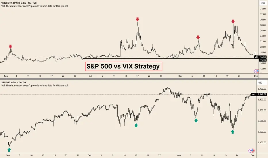 • 🔺 When the VIX spikes sharply (red arrows), the S&P 500 is usually in a capitulation phase driven by forced selling.