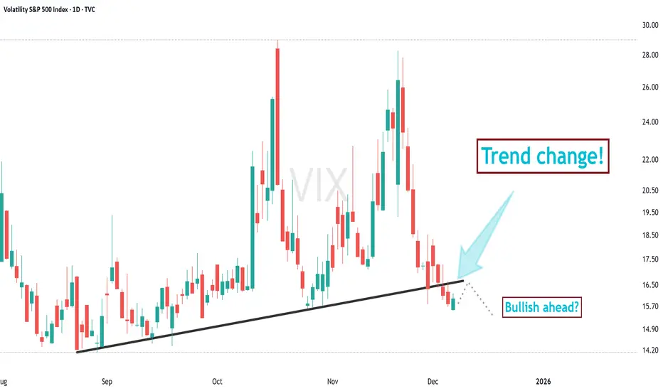 The past three days shows something we haven't seen in months: a break of the support trendline. This means two things: first, a bullish indication; second, a decrease of volatility pricing heading into the FOMC meeting next week. The market is signaling it is becoming less afraid of the FOMC meeting outcome because it knows what the Fed is most likely to do.