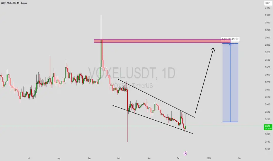 VOXELUSDT is forming a clear falling wedge pattern, a classic bullish reversal signal that often indicates an upcoming breakout. The price has been consolidating within a narrowing range, suggesting that selling pressure is weakening while buyers are beginning to regain control. With consistent volume confirming accumulation at lower levels, the setup hints at a potential bullish breakout soon. The projected move could lead to an impressive gain of around 140% to 150% once the price breaks above the wedge resistance.