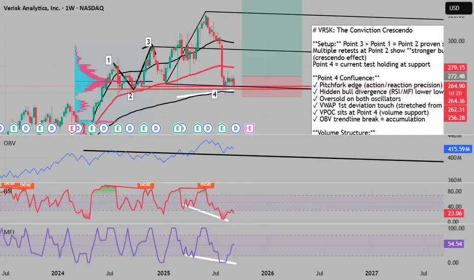Point 4 touches the **1st standard deviation below VWAP** (anchored from market low). Historically, VRSK has respected VWAP as dynamic support. While this deviation could warn of weakness, within our broader narrative it suggests price has been **stretched too far** from its mean - a rubber band ready to snap back.