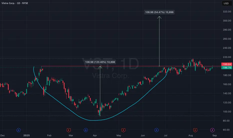 Vistra Corp. (VST) is forming a classic Cup and Handle pattern on the daily chart. The cup formation has developed over several months, with a clear resistance zone around $200 now being tested again.