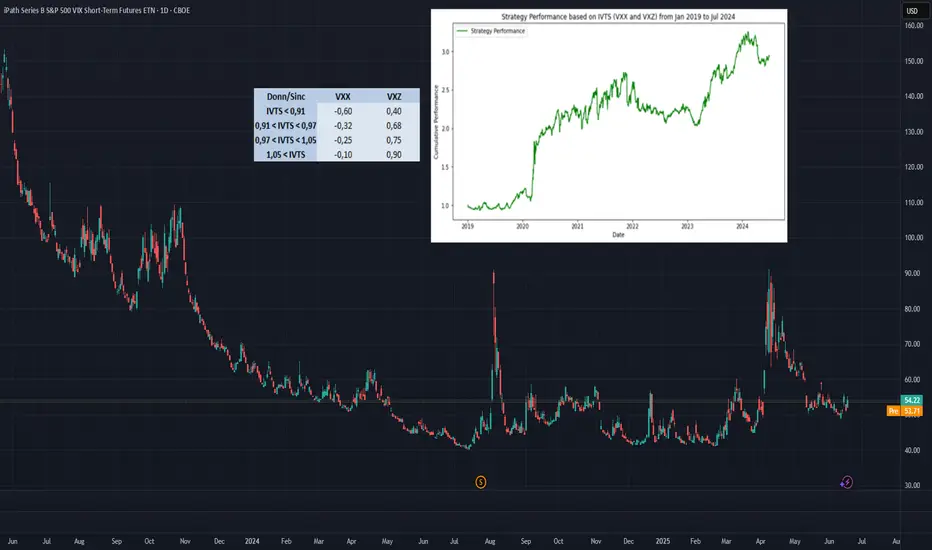 • Weighting is determined by the Implied Volatility Term Structure (IVTS), calculated as VIX / VIX3M. This approach adjusts positions based on the shape of the VIX futures curve, indicated by the IVTS. For instance, when the VIX futures curve shifts from contango (where near-term futures are cheaper than longer-term ones) to backwardation (where near-term futures are more expensive), it involves reducing short positions in VXX and increasing long positions in VXZ.
