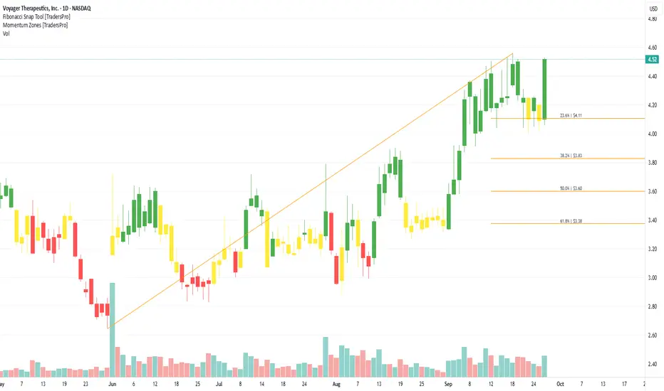 On the chart, a confirmation bar with rising volume highlights bullish momentum. The price has entered the momentum zone after breaking above the .236 Fibonacci level. A trailing stop can be set just below this Fibonacci line using the Fibonacci snap tool, helping traders secure profits while leaving room for more upside potential.