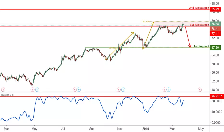 WELL is approaching our first resistance where we expect a drop below this level to our first support level. Stochastic is also approaching resistance where we might be seeing a drop below this level.