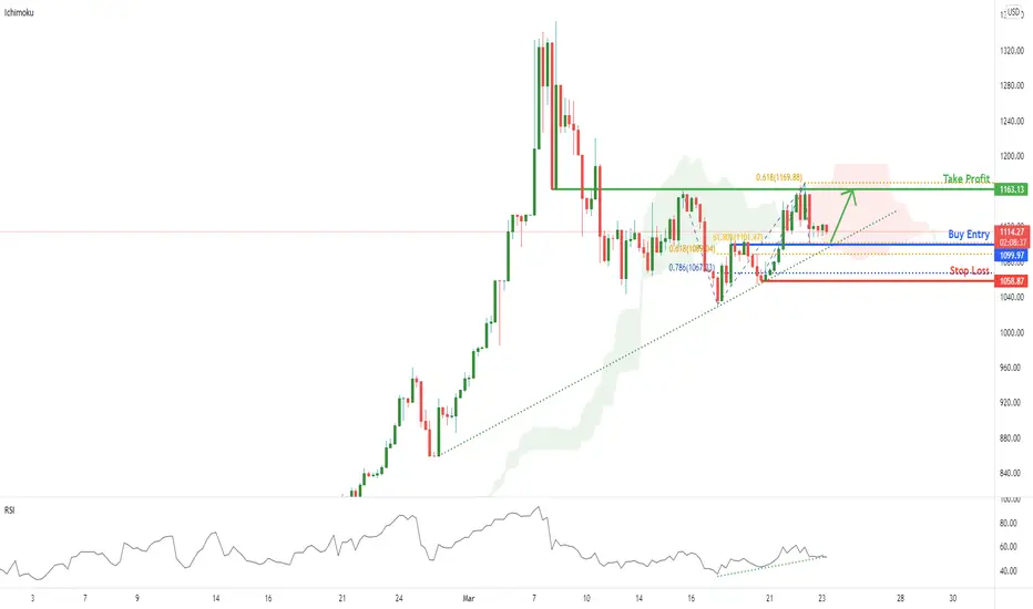 Prices are on bullish momentum and abiding to our ascending trendline support. We see the potential for a bounce from our Pivot at 1099.97 in line with 61.8% Fibonacci retracement and 61.8% Fibonacci Projection towards our Take Profit at 1163.13 in line with 61.8% Fibonacci Projection. RSI is forecasting the bullish momentum and also Ichimoku is forecasting the bounce, further supporting our bullish bias.
