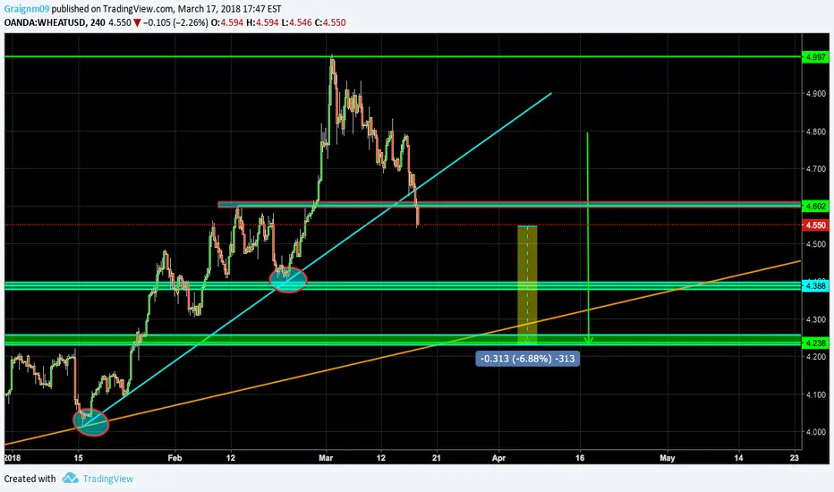 Alright, so I've been looking at wheat for some time now, and to be totally honest I don't actually think that we're done from a selling stand point. I believe that prices could still go lower, potentially near the 4.400/4.200 Region.