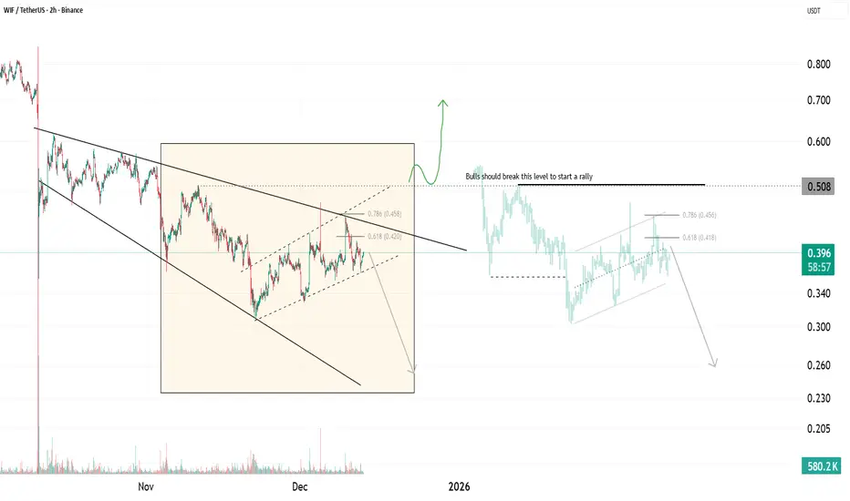 WIF is currently trading inside a well defined descending channel, where price has been respecting both the upper resistance and the lower support with clean reactions. The recent move shows price stabilizing near the lower half of the channel, suggesting selling pressure is slowing down.