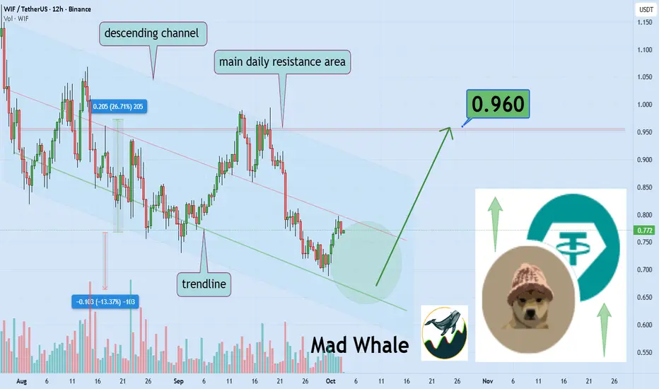 WIFUSDT is trading within a descending channel, hovering near key daily trendlines. A breakout above the upper resistance could trigger a potential 26% rally toward $0.96.
