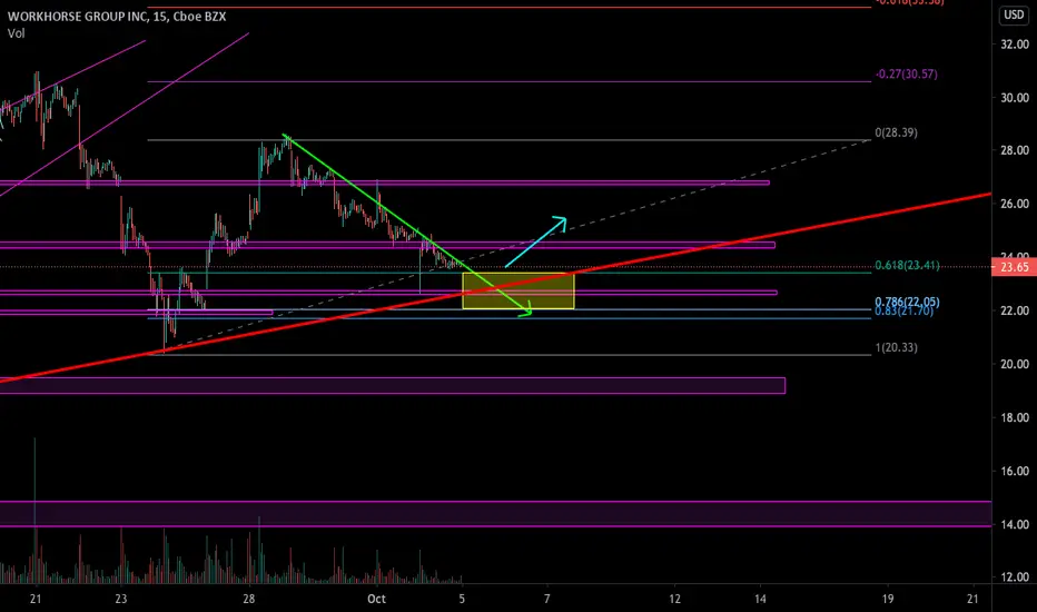 WKHS waiting to break out from this falling wedge! Expecting a drop to my .618 and bounce up. If we break under 23.40 we could hit my support zone at 22.69 . Looking to see a move back up to $27 if price can hold above 23.40.