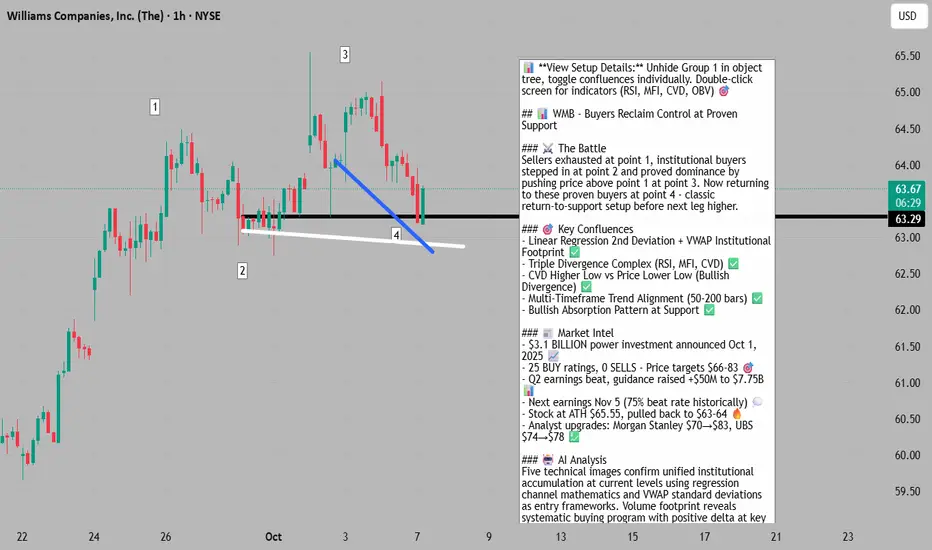 All five images tell the same cohesive story: institutional players are actively accumulating WMB at the current level using the regression channel 2nd deviation and VWAP standard deviation as mathematical frameworks for their entry zones. The multi-indicator divergences (RSI, MFI, CVD) are classic pre-reversal signals that typically precede 3-7% moves in liquid large-caps. The volume footprint data is particularly compelling because it shows real money being deployed, not just technical patterns. For trade execution, this suggests: (1) Entry at current levels near $63-64 is well-supported, (2) Stop loss should be placed below the volume profile accumulation zone around $61.50-62, (3) Initial target is the recent high at $65.55 with extensions to analyst targets at $66-68, (4) Position sizing should account for earnings volatility in 4 weeks - either take profit before Nov 5 or use wider stops to survive potential earnings-related whipsaw.