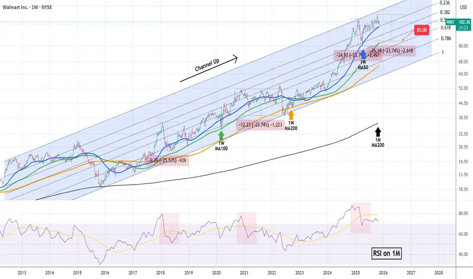 With the 1M RSI printing a formation that previous delivered two technical pull-backs of -23.74%, we expect the stock to start correcting again if it closes below the 1W MA50. All previous breaks below it, eventually led to a 1W MA100 (green trend-line) test.