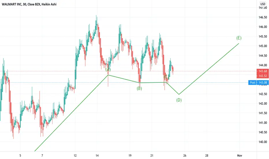 I see WMT dropping tomorrow to point (D) but rising to point (E) after the stimulus deal, if there is one. I think there will be a deal and this will be a catalyst for WMT to moon shoot to an all time high. What is my strategy? I bought 30 puts today and plan on selling during tomorrows low, after I sell at the low point I am going to buy calls for $150 a month out. Stay tuned for trade activity and feel free to comment your thoughts.