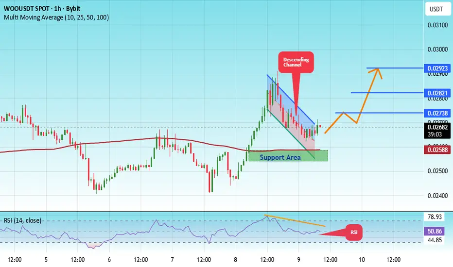 There is a key support zone in green at 0.02557. The price has bounced from this level multiple times and is expected to bounce again.