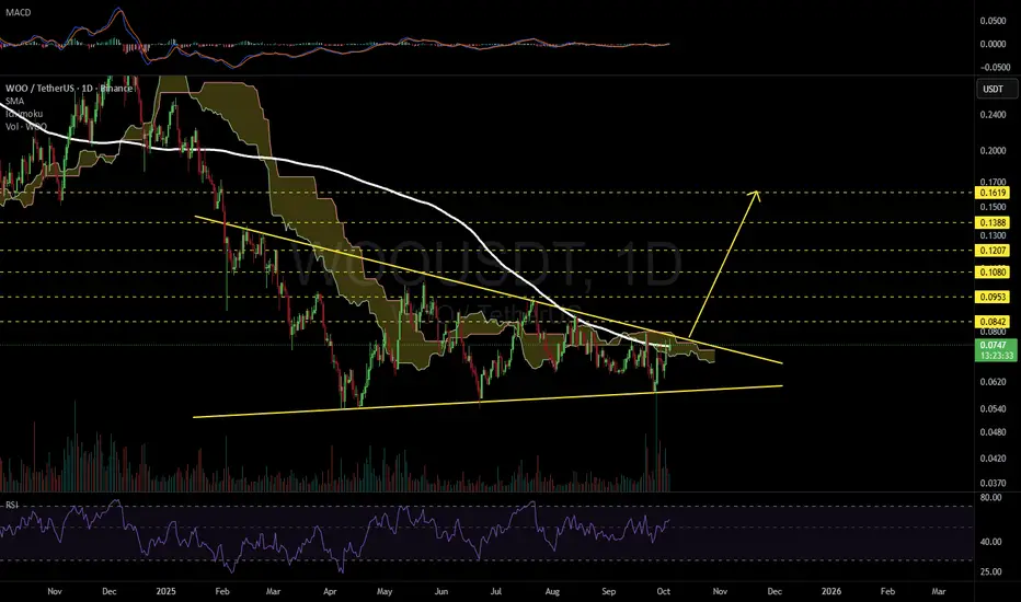 #WOO is moving inside a symmetrical triangle on the daily chart. For the bullish scenario, it must break above the resistance cluster — which includes the triangle resistance, the daily SMA200, and the Ichimoku cloud. If that happens, the potential targets are: