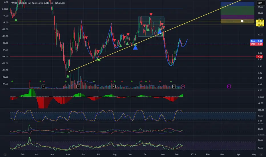 If WRD can push through and close ABOVE the yellow trendline, it confirms the breakdown was a "False Flag" or "Bear Trap."