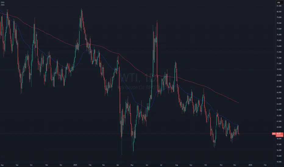 WTI is expected to remain under pressure this week, trading mostly in the $57–59 range with a downside bias toward $56. A breakout above $60 is unlikely unless a major bullish catalyst appears.