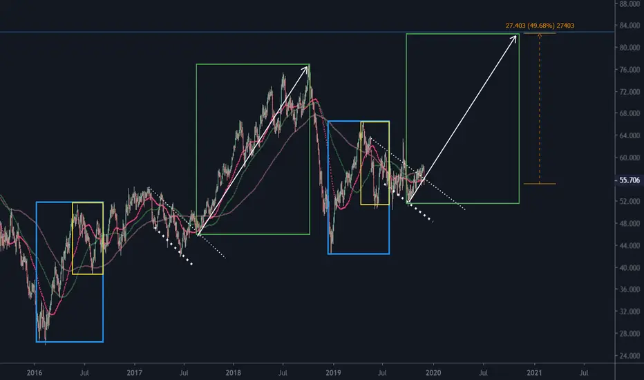 I suppose a fractal repetition can develop. The figure shows that in both cases the rise begins with an upward eruption from a descending channel. This is the scenario I am expecting right now. Therefore, in the coming time I will be looking for long positions in the oil price.