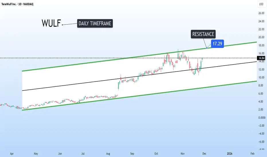 WULF is currently showing strong upward momentum on the daily chart, targeting the upper boundary of its current ascending channel, which is situated near the $17 level.