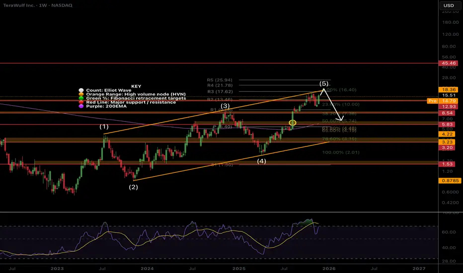 WULF Price appears exhausted at the upper channel boundary, and I have exited completely for now. The Elliot wave pattern completes a leading diagonal, which hints at higher to go after a deep wave 2 pullback, which could end at the 0.382 Fibonacci retracement, $8, but a more likely target is the 0.5 Fib at $5.84 with downside momentum. Also the weekly 200EMA.