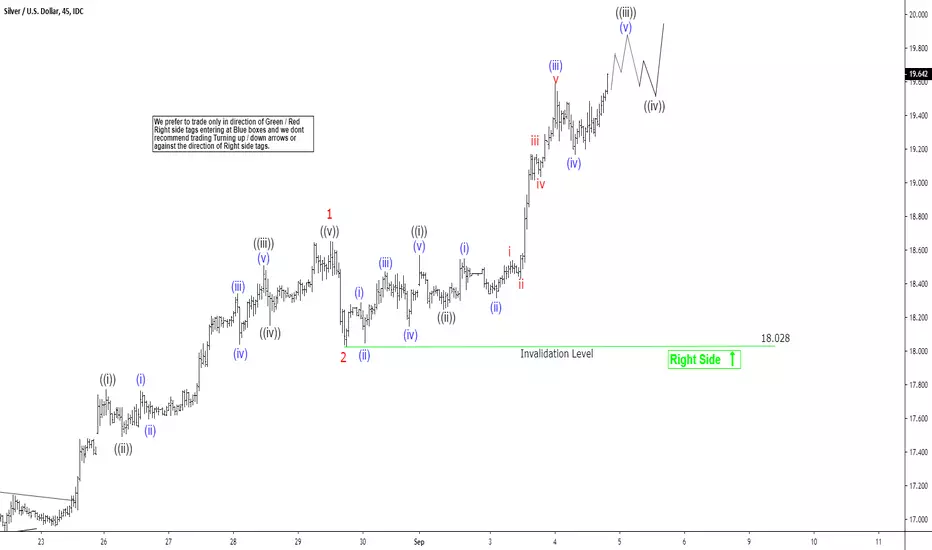 Since forming the low on November 2018 at $13.9, Silver has rallied 40% to current price of $19.4. The move higher from $13.9 low took the form of a 5 waves impulsive Elliott Wave structure. On the 1 hour chart below, we can see wave (4) pullback ended at $16.92. The metal has since resumed higher in wave (5) with subdivision as another impulse in lesser degree. Up from $16.92, wave 1 ended at $18.65 and wave 2 ended at $18.02.