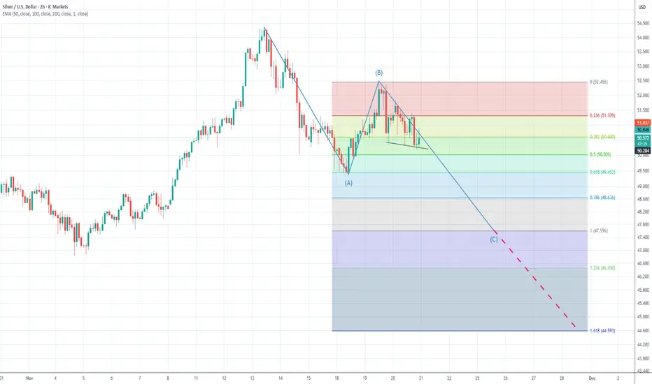 Silver (XAGUSD) has completed a clear A–B–C corrective structure, with wave B failing below the 52.45 resistance zone. The rejection from the upper boundary aligns with the broader bearish sequence and confirms that sellers remain in control.