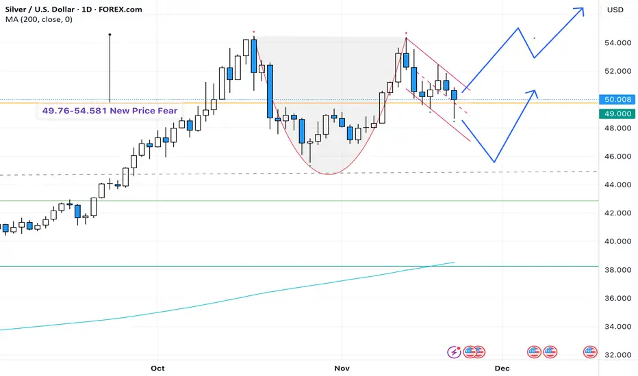 On the daily chart, silver is forming a clean Cup & Handle pattern. The price is currently consolidating within the handle, and a breakout above the key resistance at 54 USD could trigger a powerful continuation move.