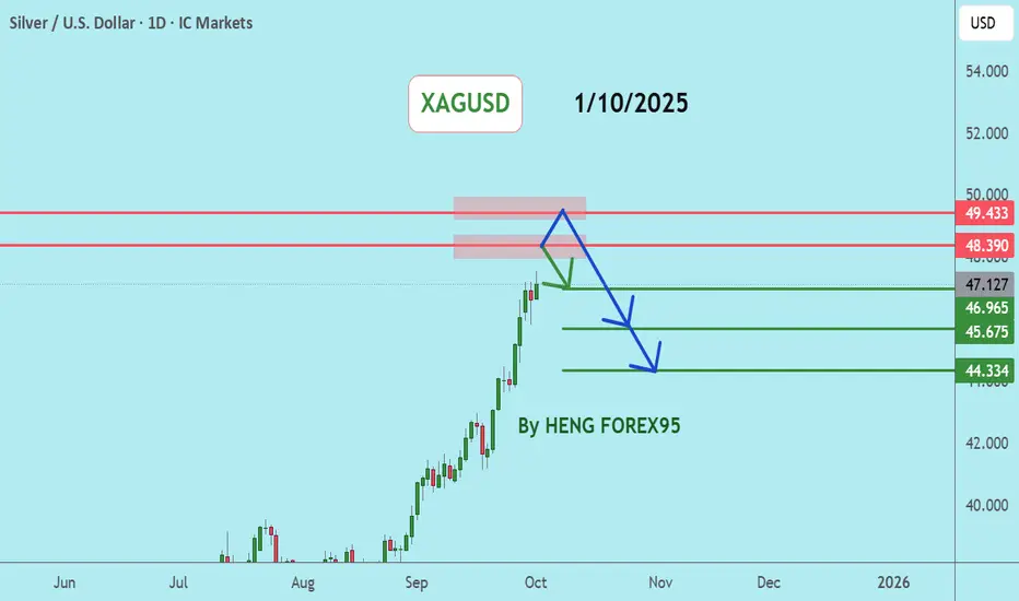 Silver price is in a strong uptrend. The price has a chance to test the 48.39-49.75 level, which is a key resistance zone. If the price cannot break through the 49.75 level, it is expected that the price has a chance to go down in the short term. Consider selling in the red zone.