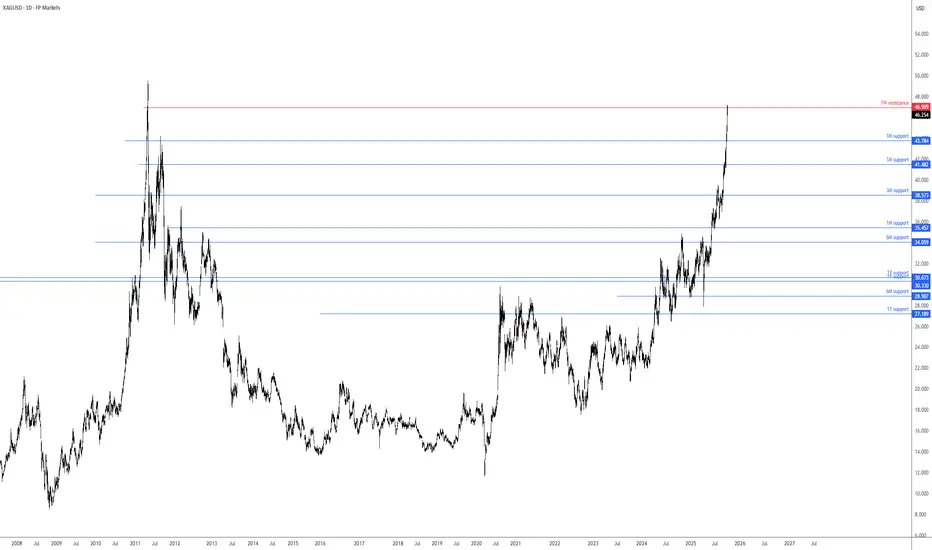 Alongside Spot Gold (XAU/USD), which continues to set all-time highs, the price of XAG/USD has reached multi-year highs of 47.18 and tested a 1W resistance level of US$46.91.