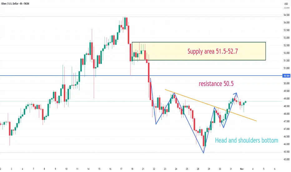 On the 4-hour chart, XAGUSD has formed a head and shoulders bottom pattern. Currently, watch for resistance around 49.4; a break above this level could lead to further upward movement, with resistance around 50.5, and further upside potential in the 51.5-52.7 area after that.