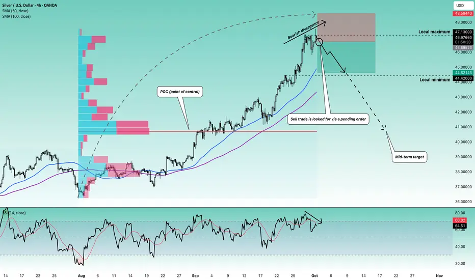 💬 Description: The buying culmination is also approaching its final phase in silver. Currently, silver has formed a bearish divergence, suggesting a downward technical reversal. The medium- and long-term priorities are more confident for sellers, but short-term factors also seem to indicate selling.