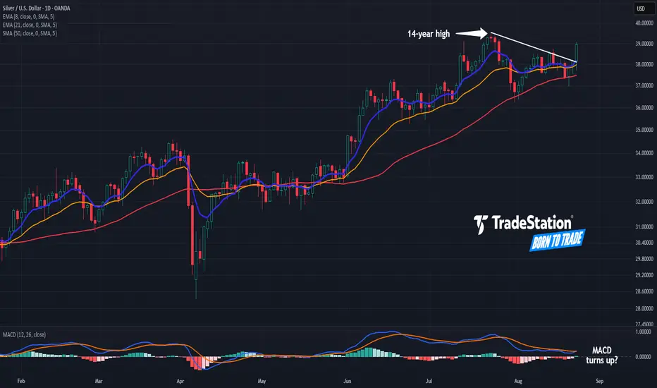 Silver hit a 14-year high last month, and now traders may think the white metal has further upside.