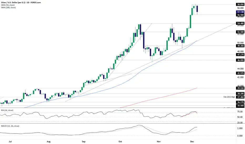 Silver has completed a three-candle evening star pattern following a sharp run higher, warning of bearish reversal risk. However, before acting on the signal, it would be preferable to see the price push below $56.50 before considering short setups, providing a level where a stop could be placed above it for protection against reversal.