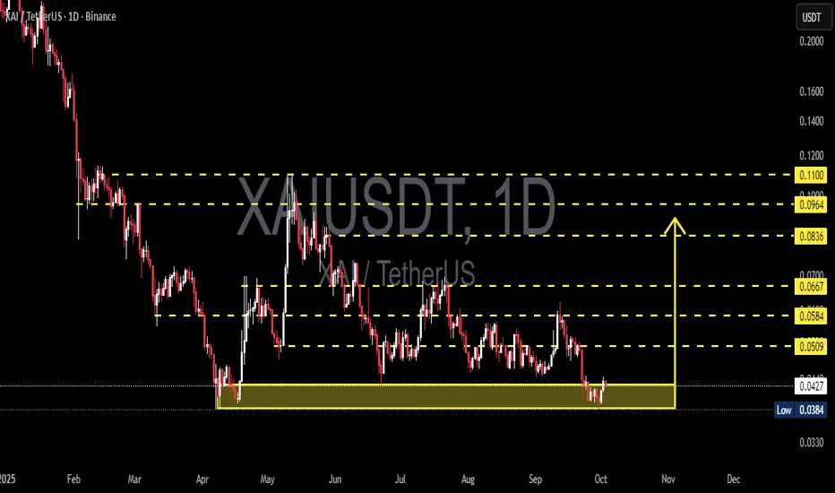 The daily chart of XAI/USDT shows a prolonged downtrend structure that has now reached a critical accumulation zone (0.0384–0.0428). This zone has acted as a strong support multiple times, creating a make-or-break situation: