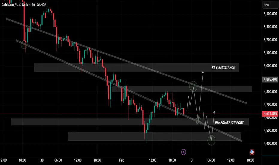 Gold is currently trading inside a well-defined descending channel, which clearly shows that the overall market structure is bearish. Price has been making lower highs and lower lows, confirming sustained selling pressure.