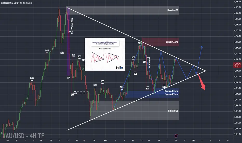 - GOLD remains inside a Symmetrical Triangle, currently showing weakness at the upper boundary. With lower highs forming and supply active at 4120–4140, selling from resistance remains the preferred strategy.