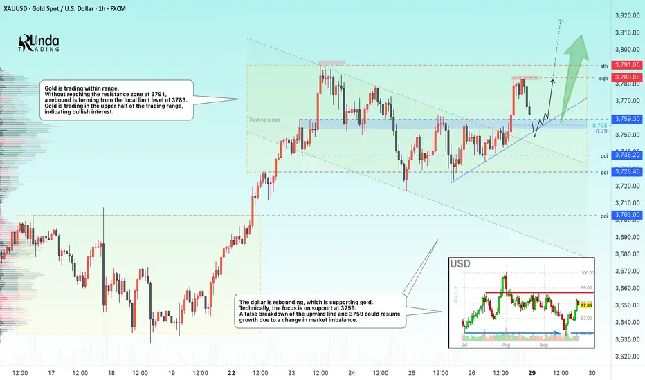 Gold is trading in the upper half of the current trading range of 3728-3791. The US session initiated the end of the technical correction, which ended with a breakout of the consolidation resistance at 3755. A momentum of 300 pips was formed, and the price hit the local limit resistance zone of 3783, from which the market began to sell off. However, the current correction of the bullish momentum is not so scary in the current perspective, as MM is forming a retest of the zone of interest to capture liquidity in order to continue the bullish trend. Thus, a false breakdown of the support zone 3759 - 3755 or the ascending line may shift the momentum towards the bulls, which in turn may lead to growth to 3783 - 3791.
