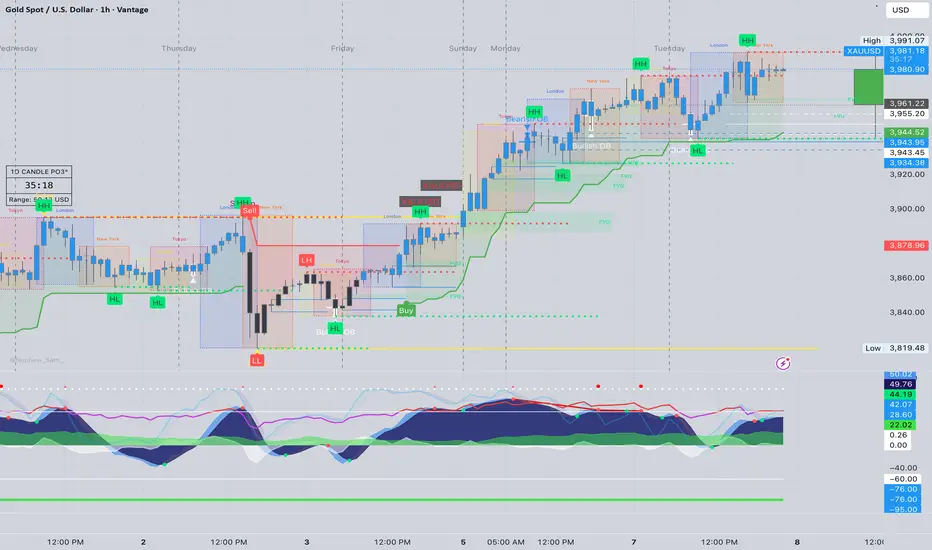 Gold closed the US session around 3,981, consolidating within a narrow range after a strong impulsive move from 3,946 → 3,991.
