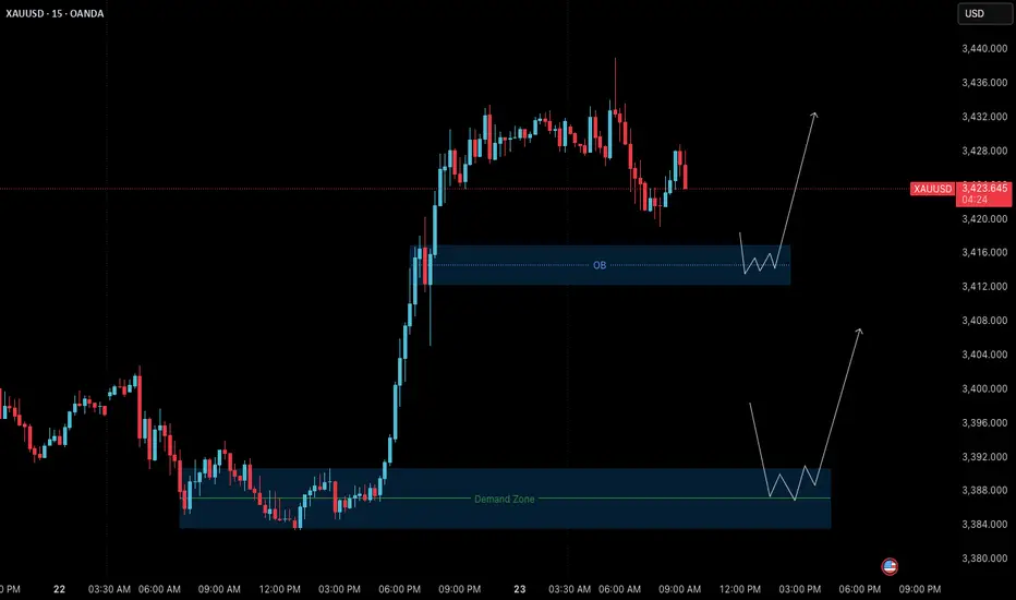 • Bullish Breakout: On July 22, price made a strong impulsive move upward from the demand base at 3384–3390, confirming bullish strength and shifting short-term structure to the upside.