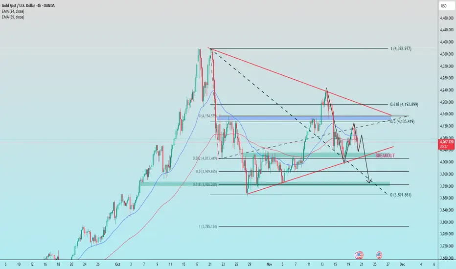 4,192 – 4,200 (Fibo 0.618): Higher resistance, aligned with the descending trendline → strong selling confluence.
