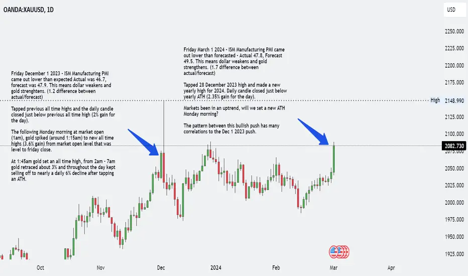 Gold has seen bullish momentum over the past few days and has succeeded to test and break all technical aspects of charting. Today's spike was significant because of how dominant it was and it shows that the big money was buying gold at a discounted price and they expect huge momentum to the upside. The institutions are majority long on gold as they have been for some time. However, this strong candle today has extreme correlation with that of the candle on 01/12/2023, which also occurred after negative ISM Manufacturing PMI data. The similarities are interesting to study. The previous ATH was set within 30min on the following Monday morning market open, and trickled back down to a lower range within an hour. #SETANDFORGET