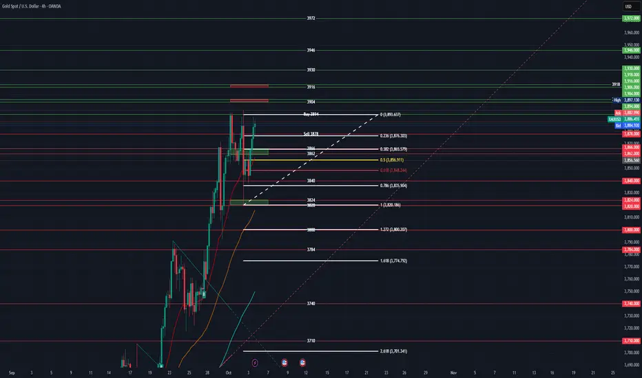 **Overall Expected Bias:** Given the recent momentum in the chart, if the week's economic data (especially jobs/inflation) comes in *strong* or *as expected (hawkish)*, it will likely lead to **USD strength**, pushing Gold from its recent highs and favoring your **Sell 3878** scenario (at least as a deeper retracement).