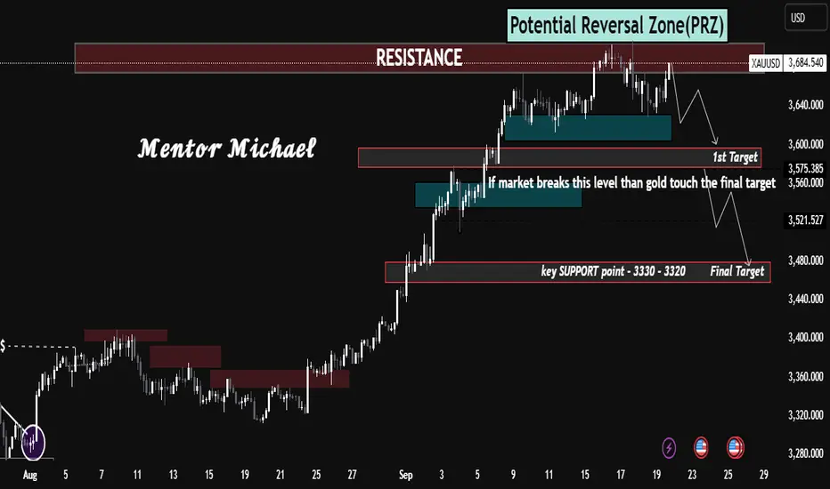 Gold (XAUUSD) is currently trading around the $3684 zone, where it has already tested a strong resistance / Potential Reversal Zone (PRZ). This area has historically acted as a supply zone, and we can observe repeated rejection candles forming here, signaling weakness in bullish momentum.