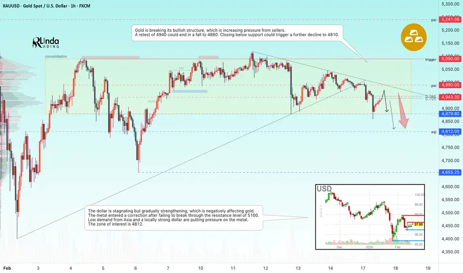 The market structure is bearish, with a retest of the 4943-4950 zone of interest forming, from which gold may fall to the 4870 range support for a retest. However, further developments will depend on the fundamental background. A rebound from 4879 and growth to 4990 - 5090 is possible, but if the price closes below 4880, this could trigger a further decline to 4880. Mixed data makes it necessary to monitor local benchmarks.
