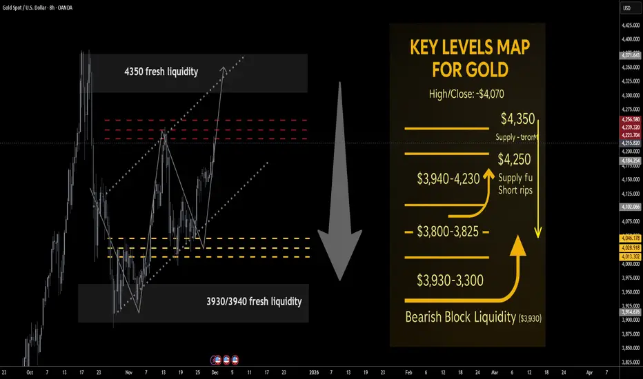 • $4,300–$4,350: extension / exhaustion band; includes the $4,350 swing high and core “blow-off” liquidity pocket.