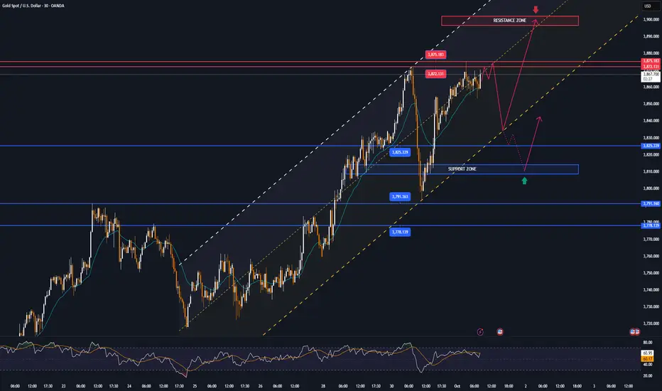 • Strong resistance: 3,872 – 3,875 USD/oz (Fib 0.618 + psychological block).