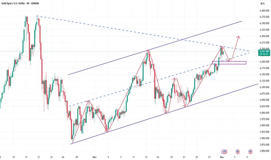 Last Friday, due to Thanksgiving, market liquidity was limited. It was expected that the market would close early and the price movement would be minimal. However, gold still broke strongly above 4200 before the close, reaching the 4220-4230 area before a strong finish. Nevertheless, the trading strategy for this week should not be to blindly chase the rally. The key focus now is on the short-term resistance zone of 4245-4260, which is the high point after gold rebounded from the strong support of 4000 on November 18th. It is also a key resistance level in this upward structure. From the 4-hour chart, this area shows very clear resistance. If the bulls cannot break through effectively in the short term, shorting at higher levels remains the preferred strategy. On the downside, the key support level to watch is the psychological level around 4200-4190. If it retraces and stabilizes without breaking through, it can be used as a reference area for short-term long positions. The overall strategy remains the same: if the resistance level holds, prioritize shorting at higher levels; if the support level holds, then look for pullbacks to go long. The trend is there, but timing is more important. Blindly chasing the rise is not a wise choice. Trading according to the structure and key points is the key to continuous stability. Continue to follow my rhythm this week. We make decisions with discipline, not let the market lead us.