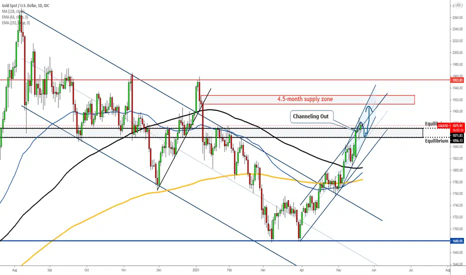 However, gold struggled to make another jump as it was actually resisted at the top of another rising channel that's channeling out of the 1.5-month channel.