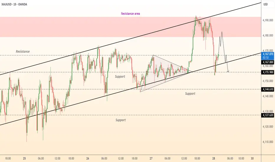 ● XAU/USD rejected the upper boundary of the ascending channel and the 4,185–4,195 resistance area, producing a sharp bearish reaction and breaking intraday momentum.